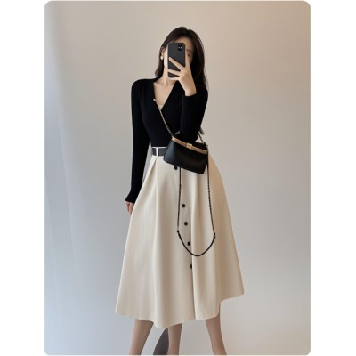 两件套装女春装新款洋气时髦法式复古打底丝绒连衣裙气质显瘦长裙
