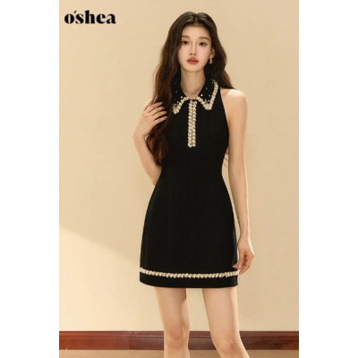 oshea 星耀黑 法式千金风连衣裙女2025新款夏季收腰显瘦重工a字裙